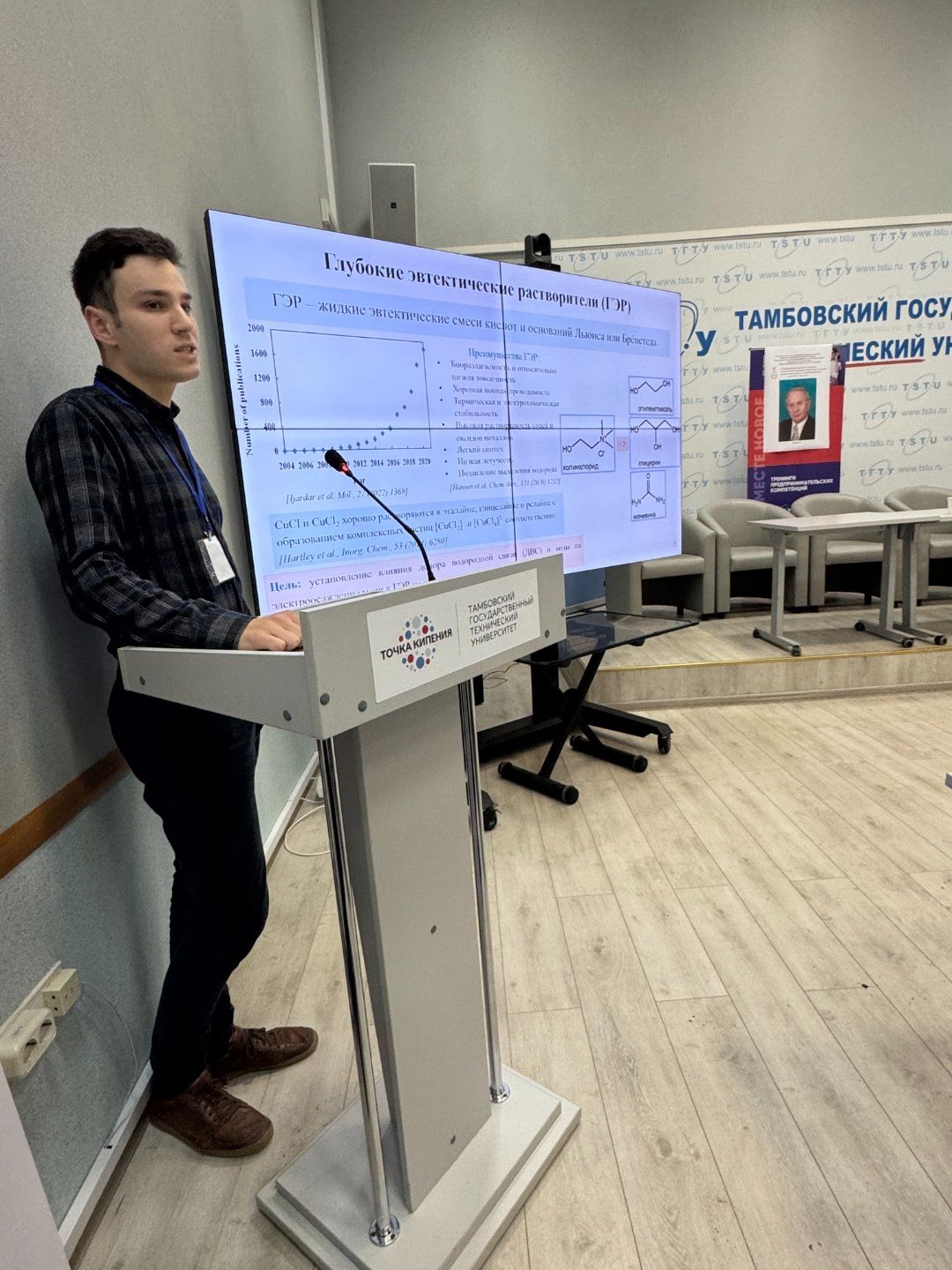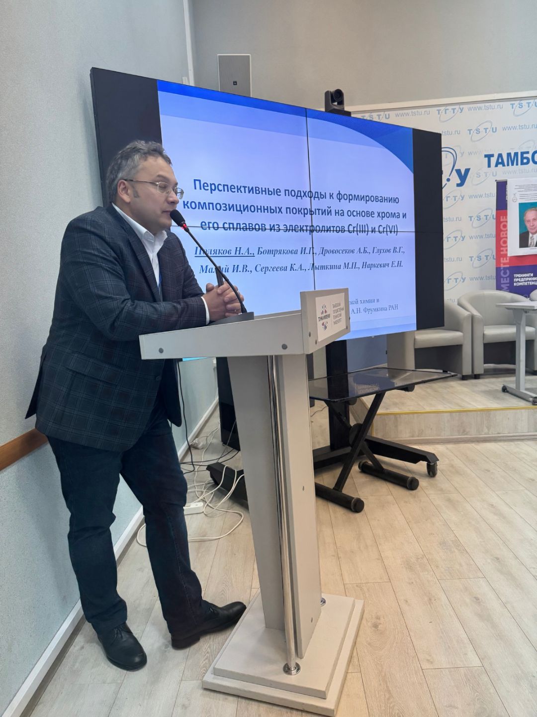 Conference participants: foreground from left to right - Dr. N.N. Polyakov (The A.N. Frumkin Institute of Physical Chemistry and Electrechemistry, Russian Academy of Sciences), background from left to right - Dr. O.A. Abonosimov (TSTU), Dr. M.N. Bobrov (St. Petersburg State Technological Institute).